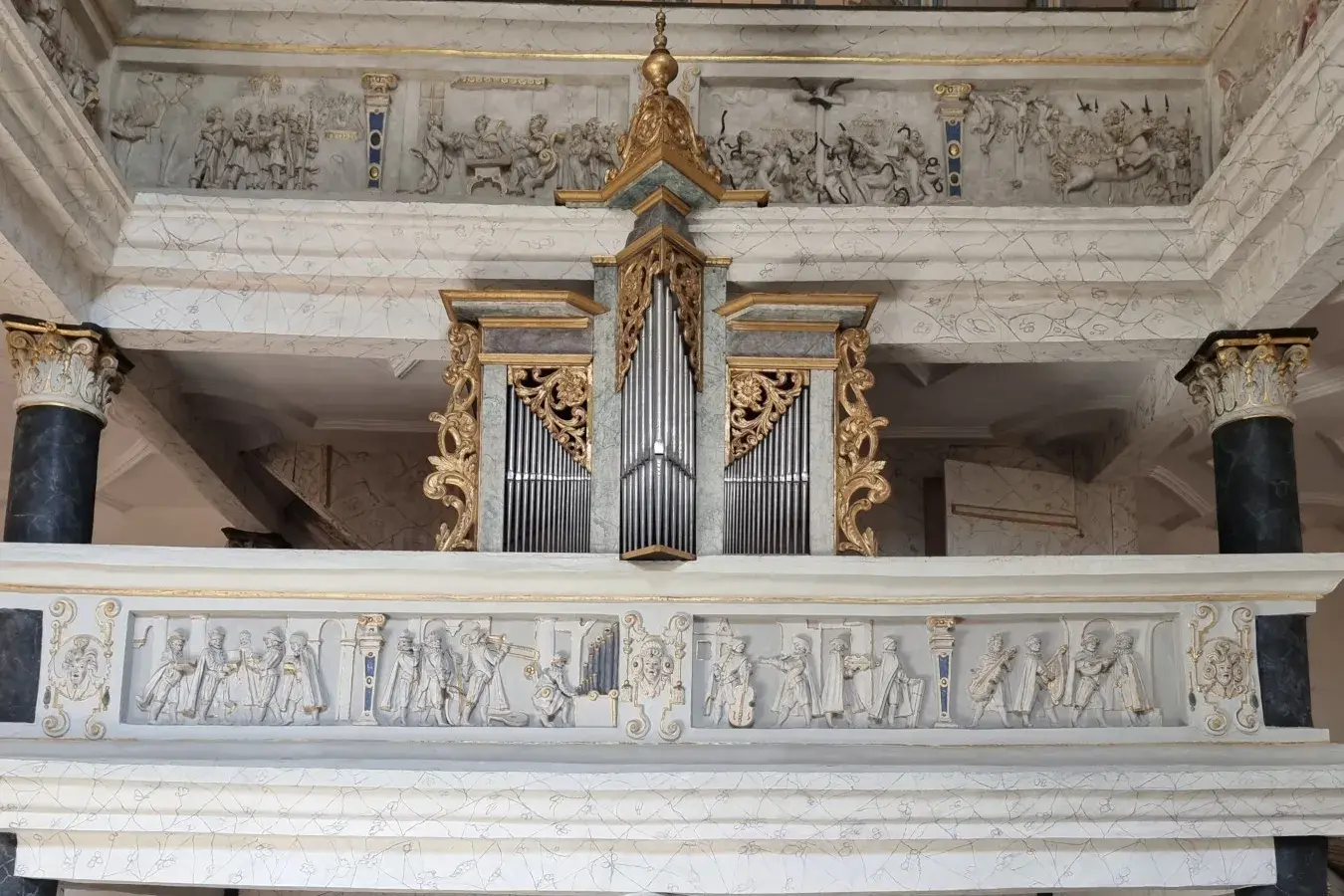 Figurenreiche Reliefs voller Details schmücken die Brüstung der Empore.